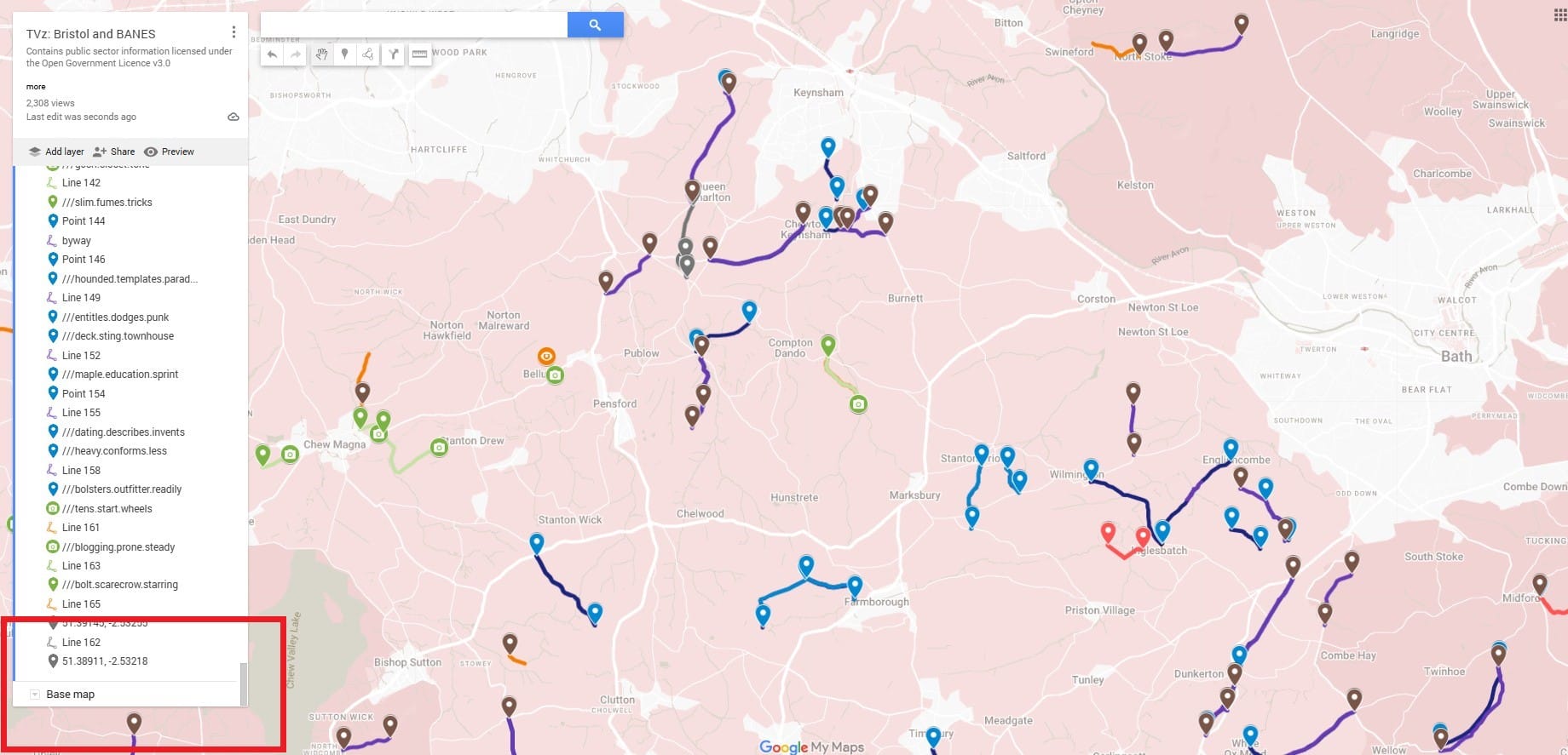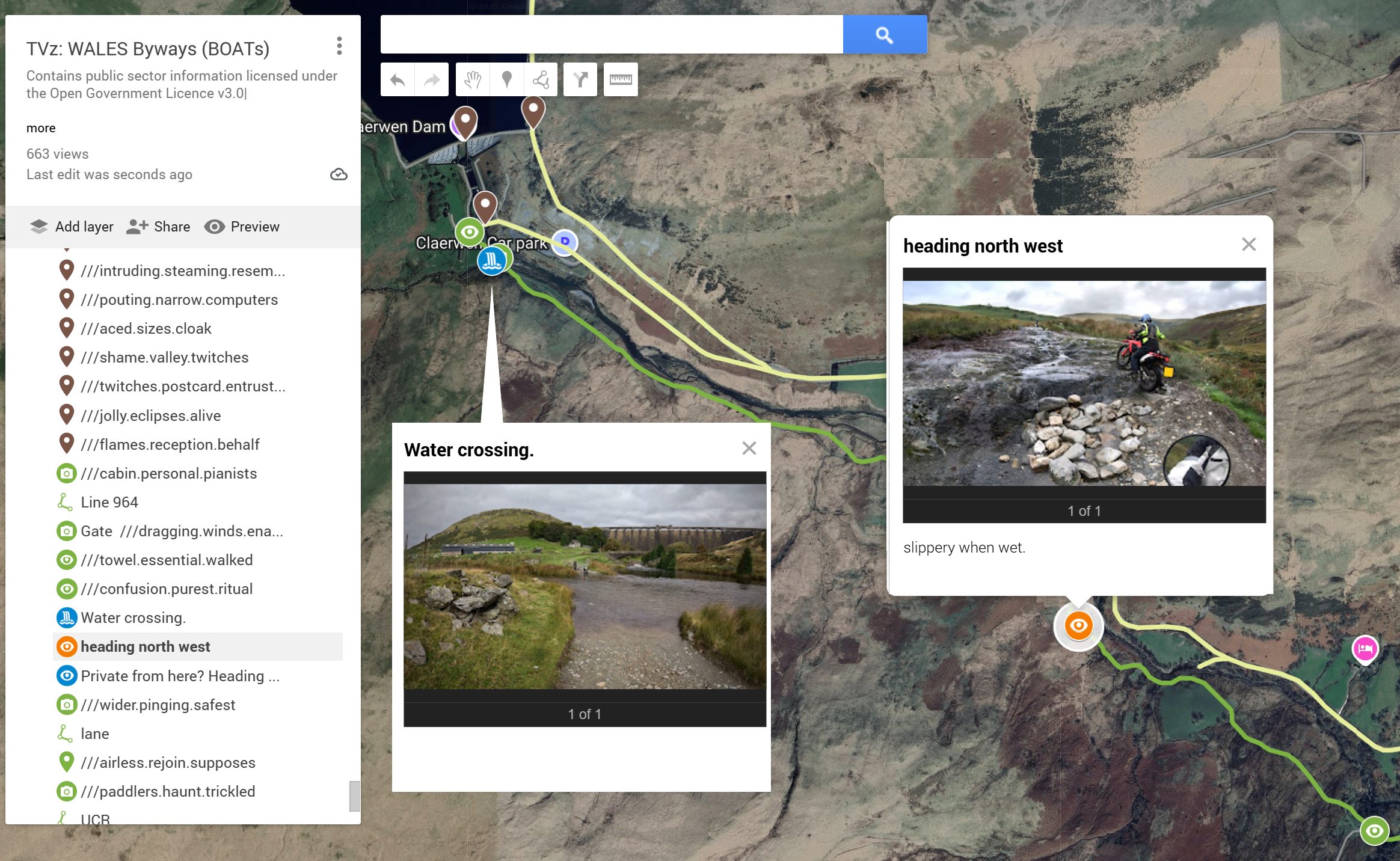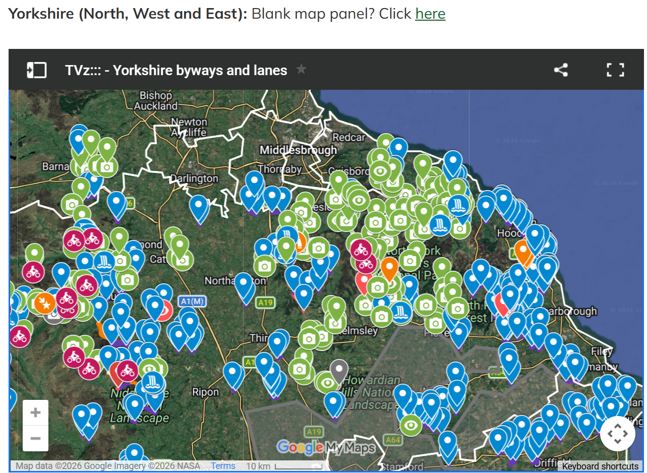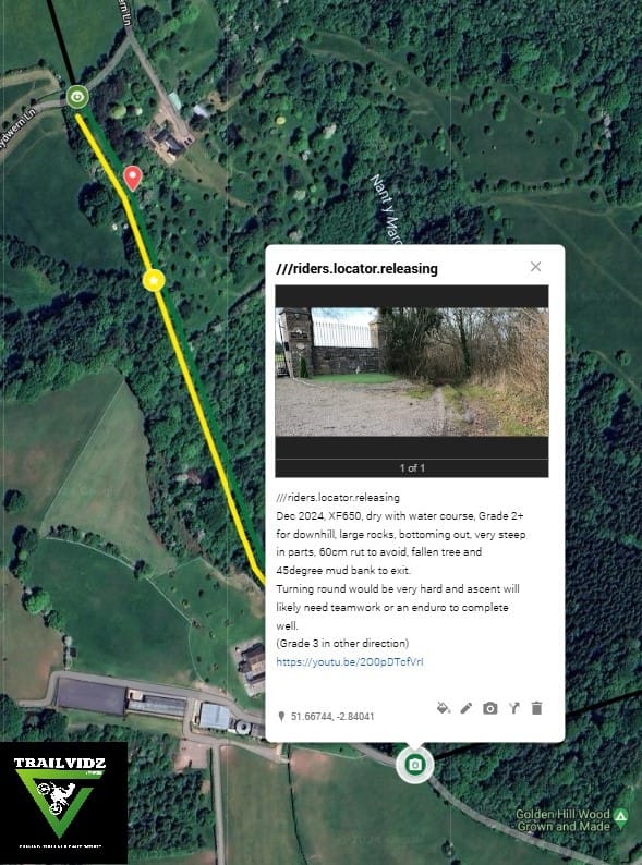 All green routes are off-tarmac trails with at least one visual reference uploaded. Click the trail's camera icon for info, pics and video links. Eye icons contain still pics. All trail entry/exits have a map pin with a W3W name for easy naming plus GPS co-ords for use in the GPX creator.