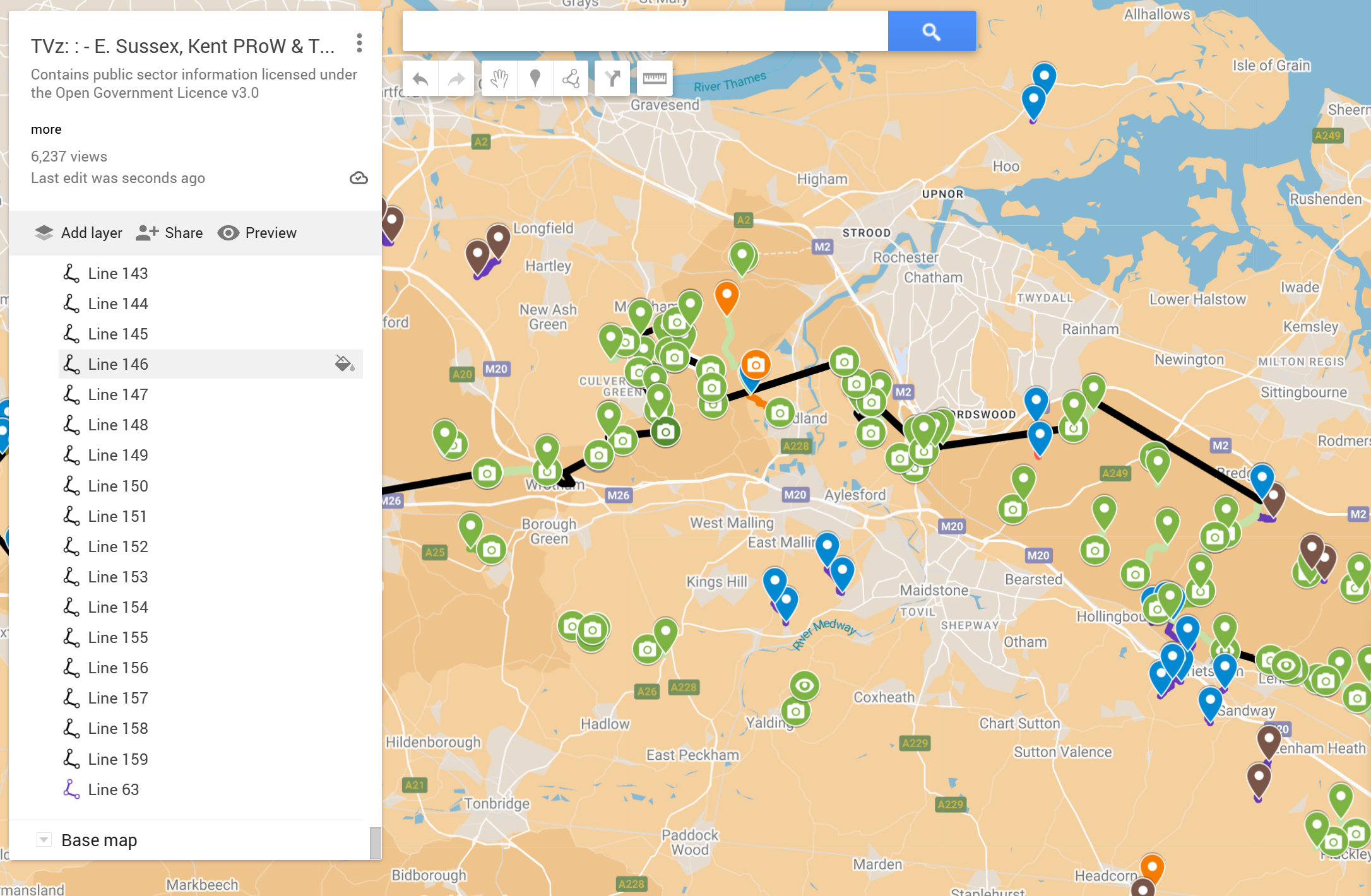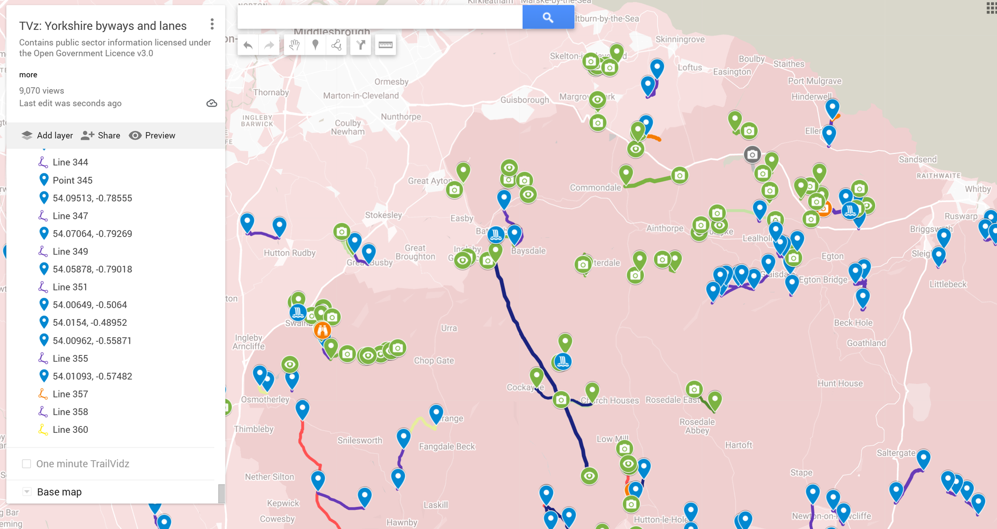 Use the layers tab to tick relevant info, click a camera icon for video links, or navigate to the pin.