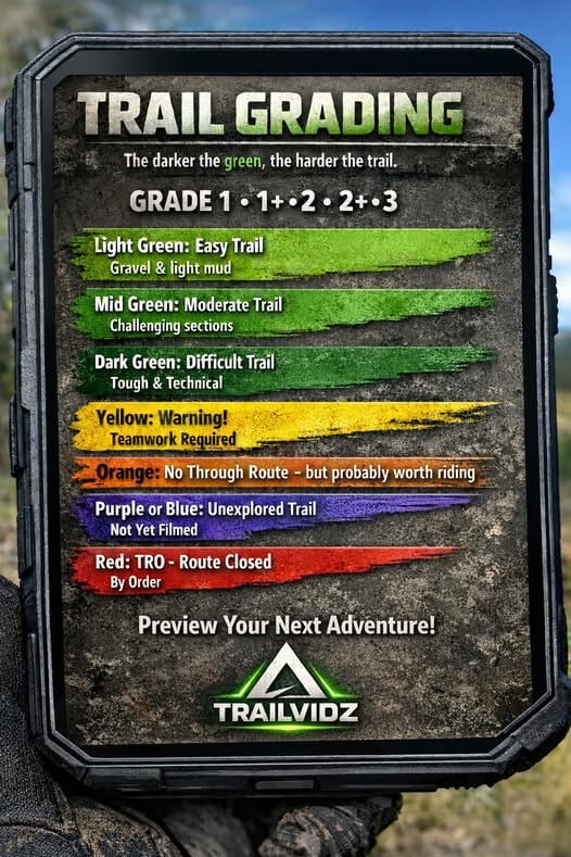 Mid green is Grade 1+ or 2, and contains terrain which will present a challenge to heavier bikes or the solo traveller without extra help if things get horizontal.
